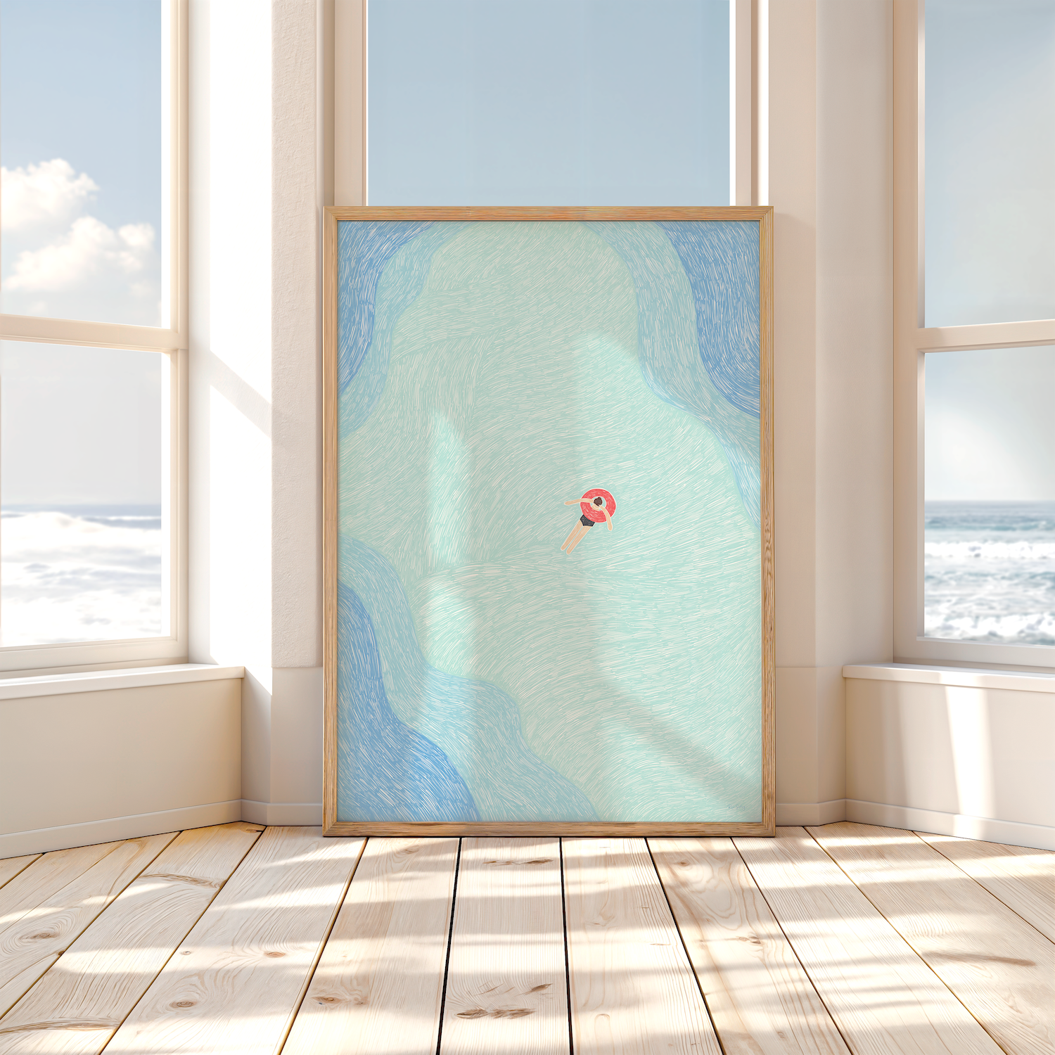 Cette estampe sur le thème de l'océan représente un moment paisible de plongée sous les vagues : des pieds qui émergent de la surface, entourés par le doux clapotis de l'eau. C'est une illustration moderne et relaxante qui capture la sensation de s'immerger dans une eau chaude d'été.