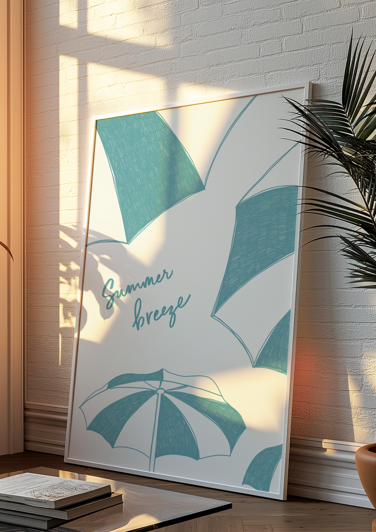 Imprimé dans une teinte apaisante – bleu profond, turquoise ou rose –, ce motif apporte une douce ambiance côtière à n'importe quelle pièce. Il invite à ralentir, à respirer et à rêver à sa prochaine escapade. Idéal pour égayer un salon, un espace de travail ou un coin lecture.