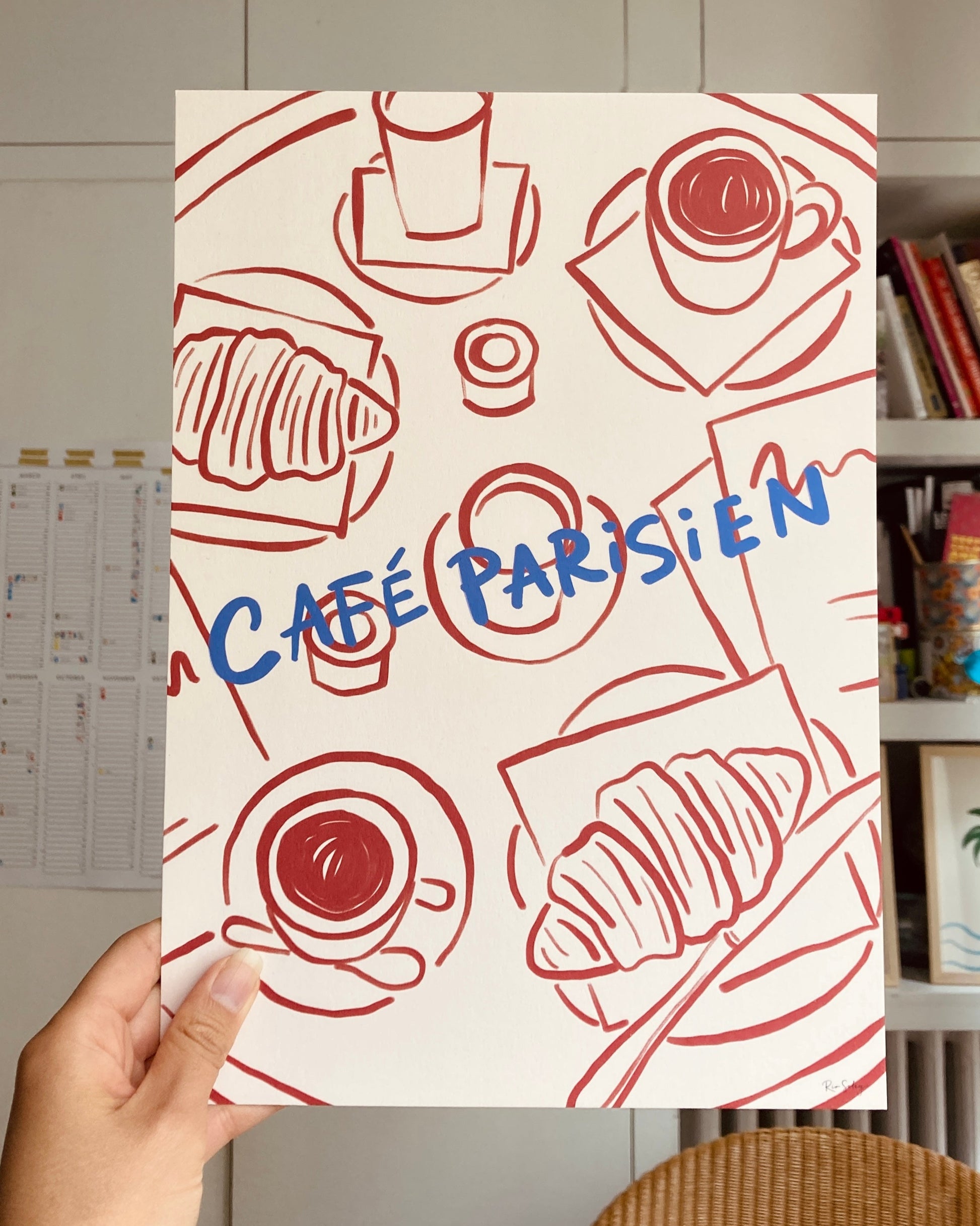 - Features croissants, coffee, and handwritten “Café Parisien” text