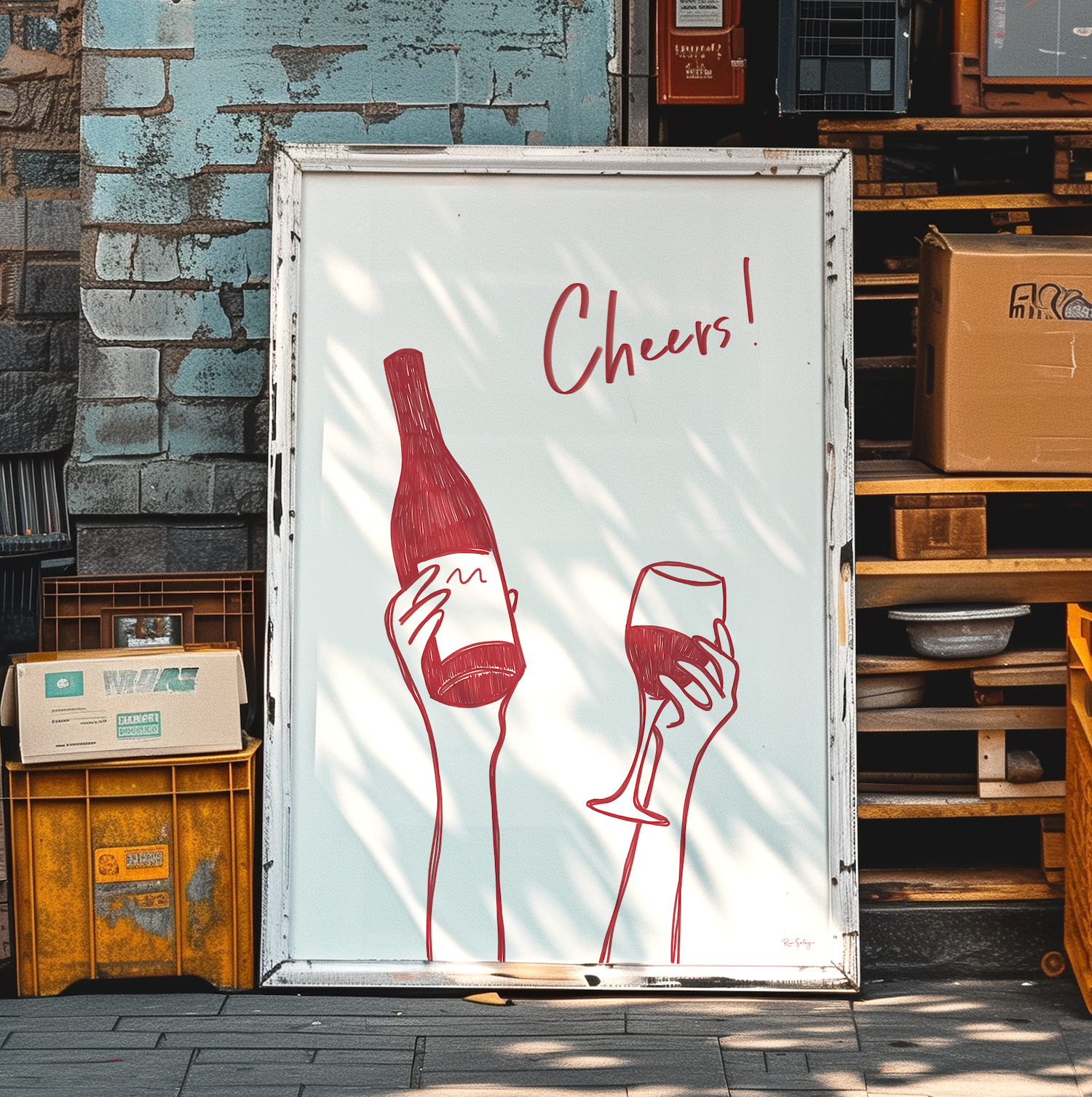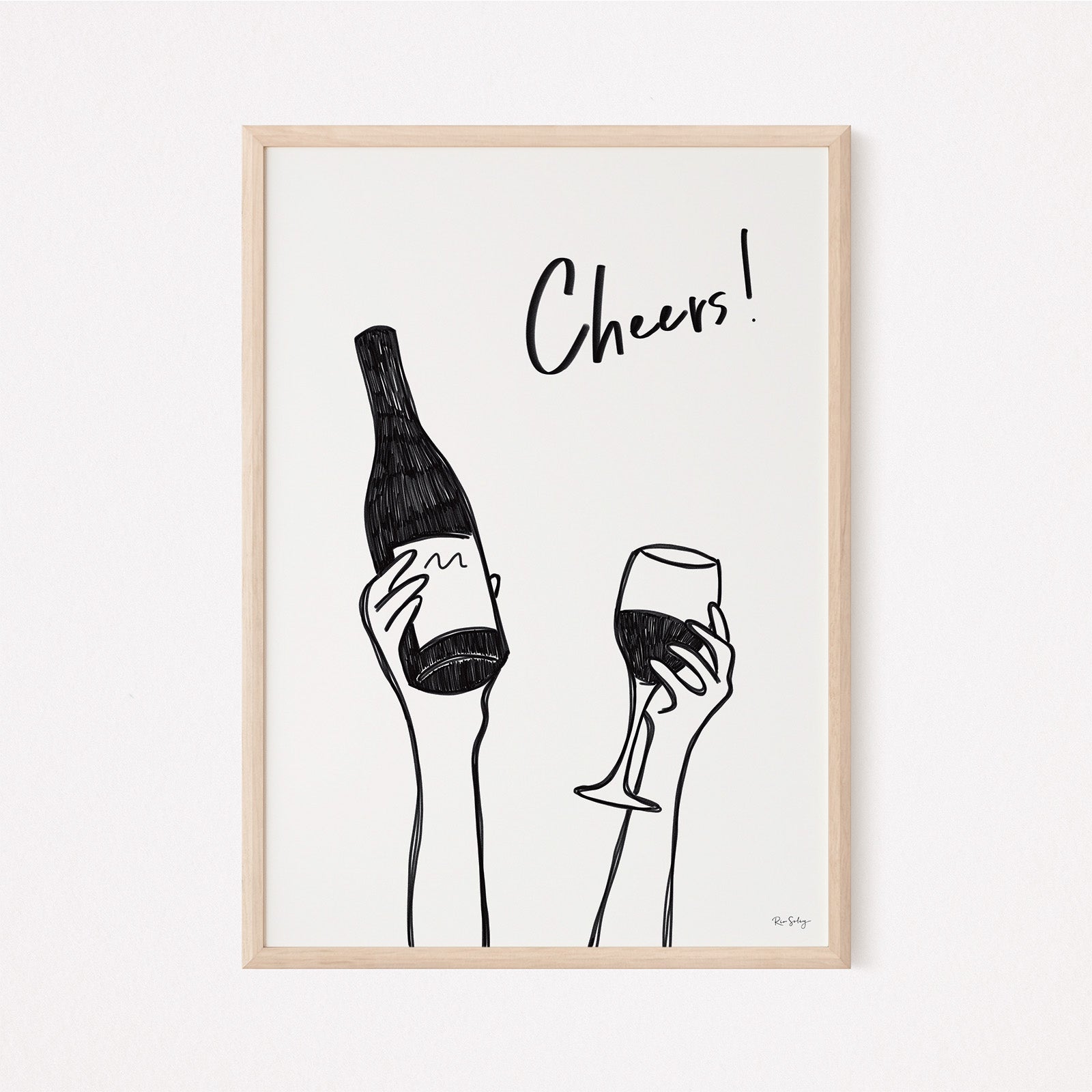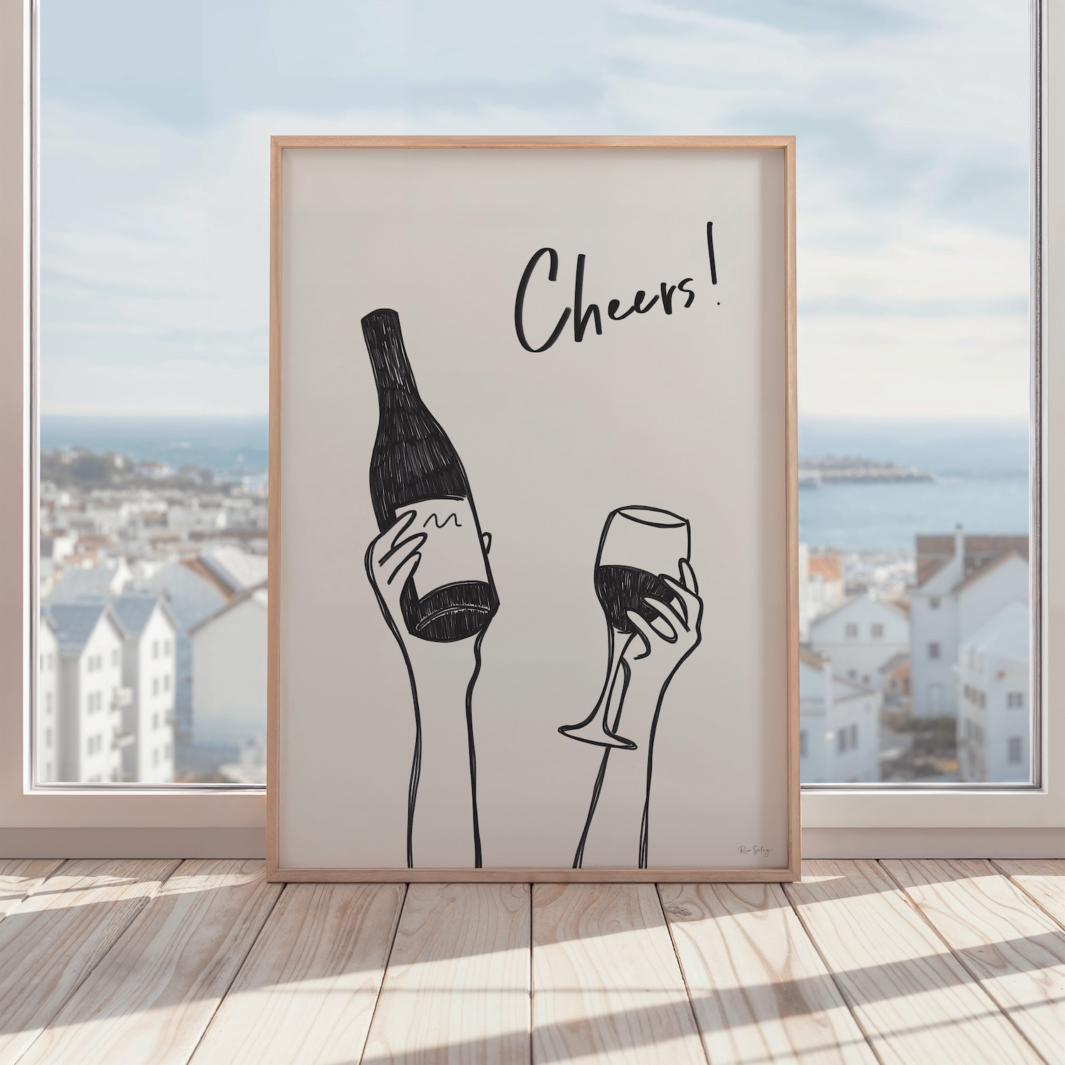 Light and cheerful "Cheers!" wine celebration wall art for wine lovers and minimalistic decor enthusiasts. Perfect for your kitchen, dining room, or bar cart decor.