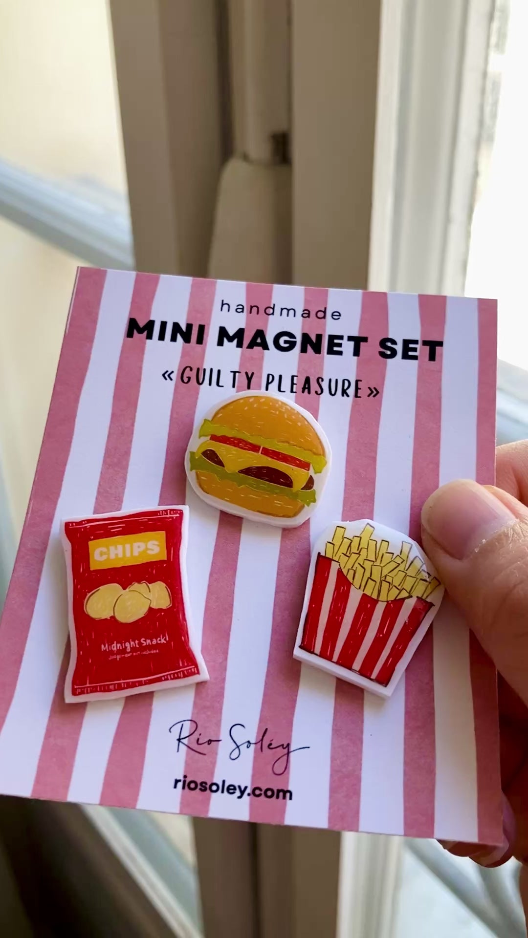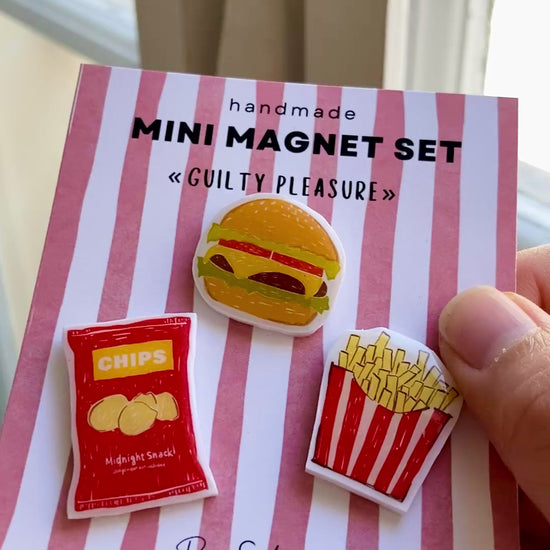 Because sometimes you just crave the junk food ♥️ The Guilty Pleasure mini magnet set features three hand-illustrated designs: a bag of crisps, a juicy burger, and golden chips.
