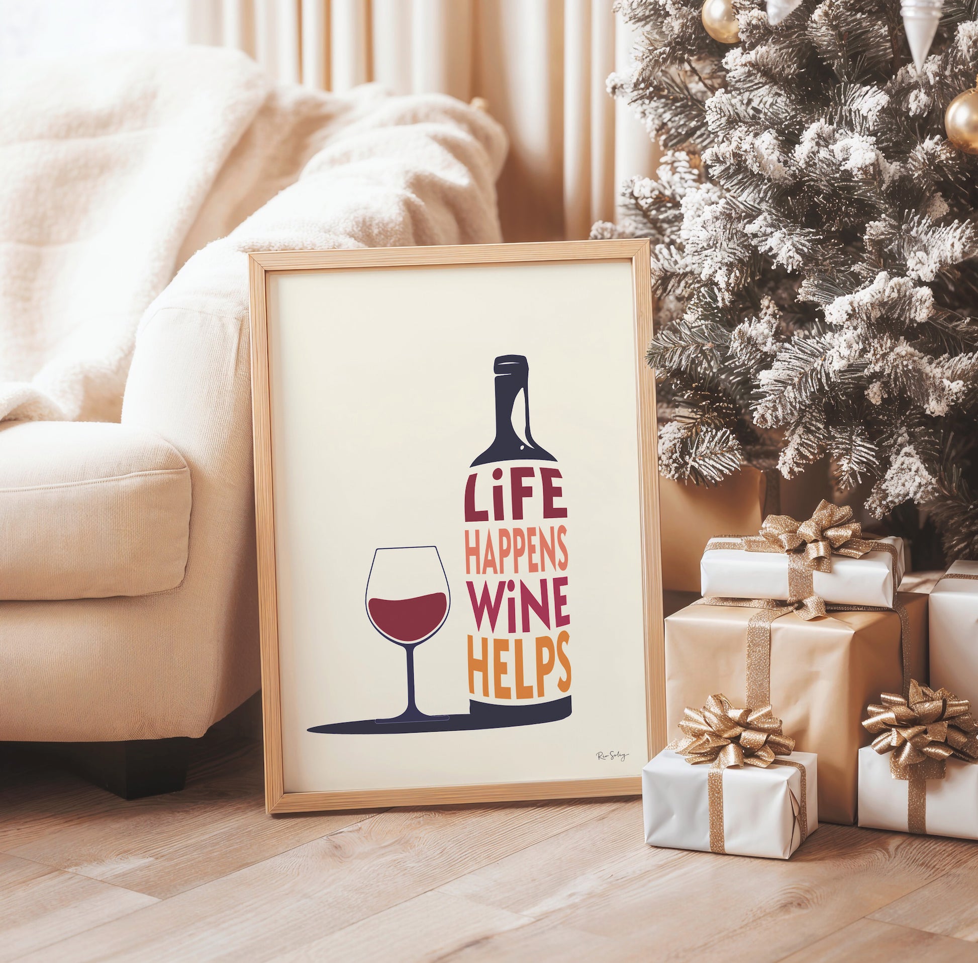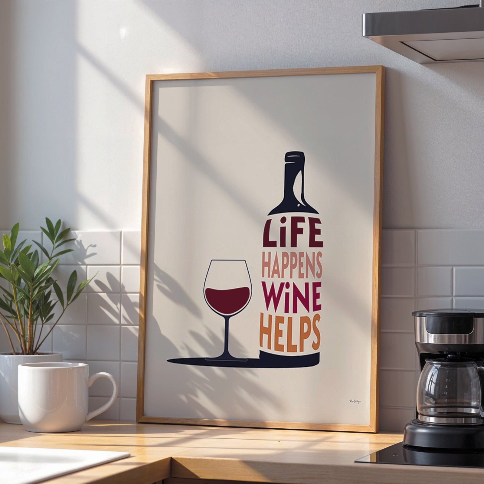 Modern wall art with wine illustration and a funny quote "Life happens, wine helps" - dedicated to wine lovers and friends who you enjoy having a glass of wine with.