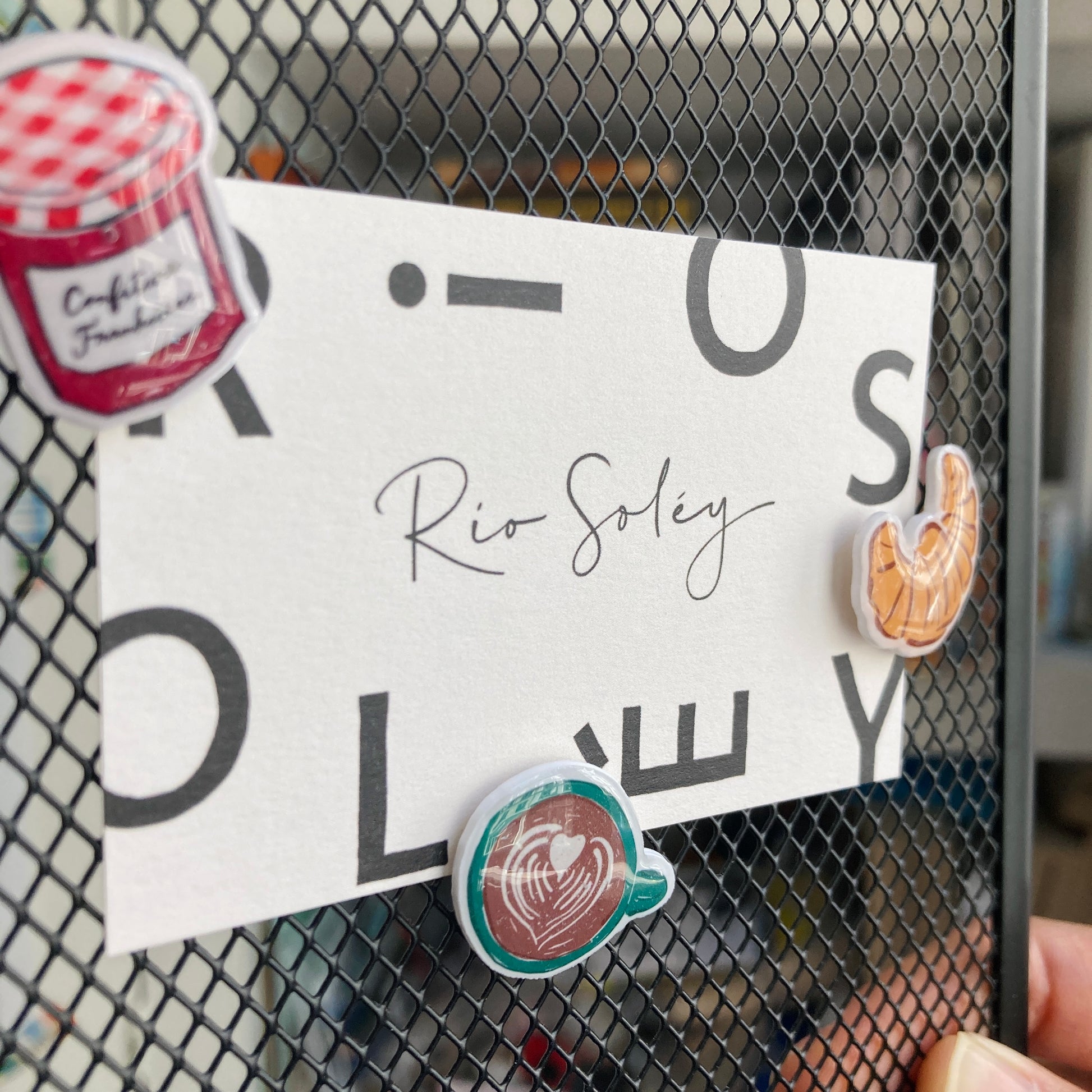 - Set of 3 mini magnets: croissant, coffee, and strawberry jam