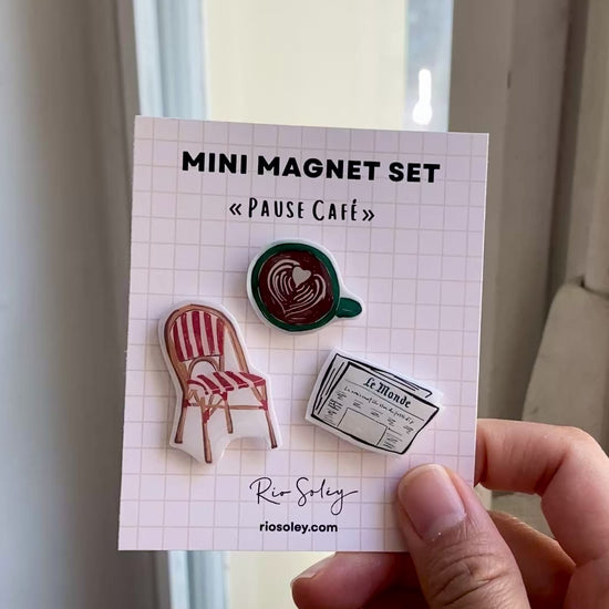 Capture the charm of a Parisian café break ♥️ The Pause Café mini magnet set includes three hand-illustrated designs: a steaming cup of coffee, a classic woven café chair, and the iconic Le Monde newspaper.