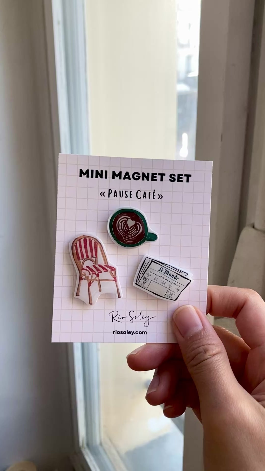 - Set of 3 mini magnets: coffee, café chair, and newspaper