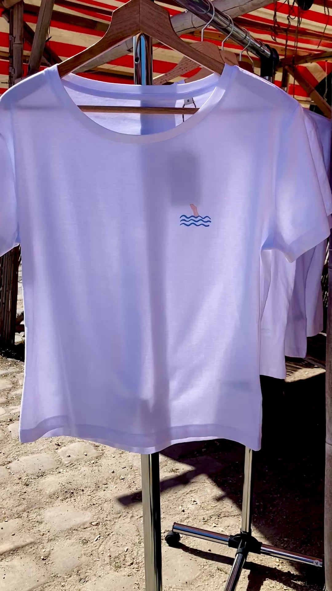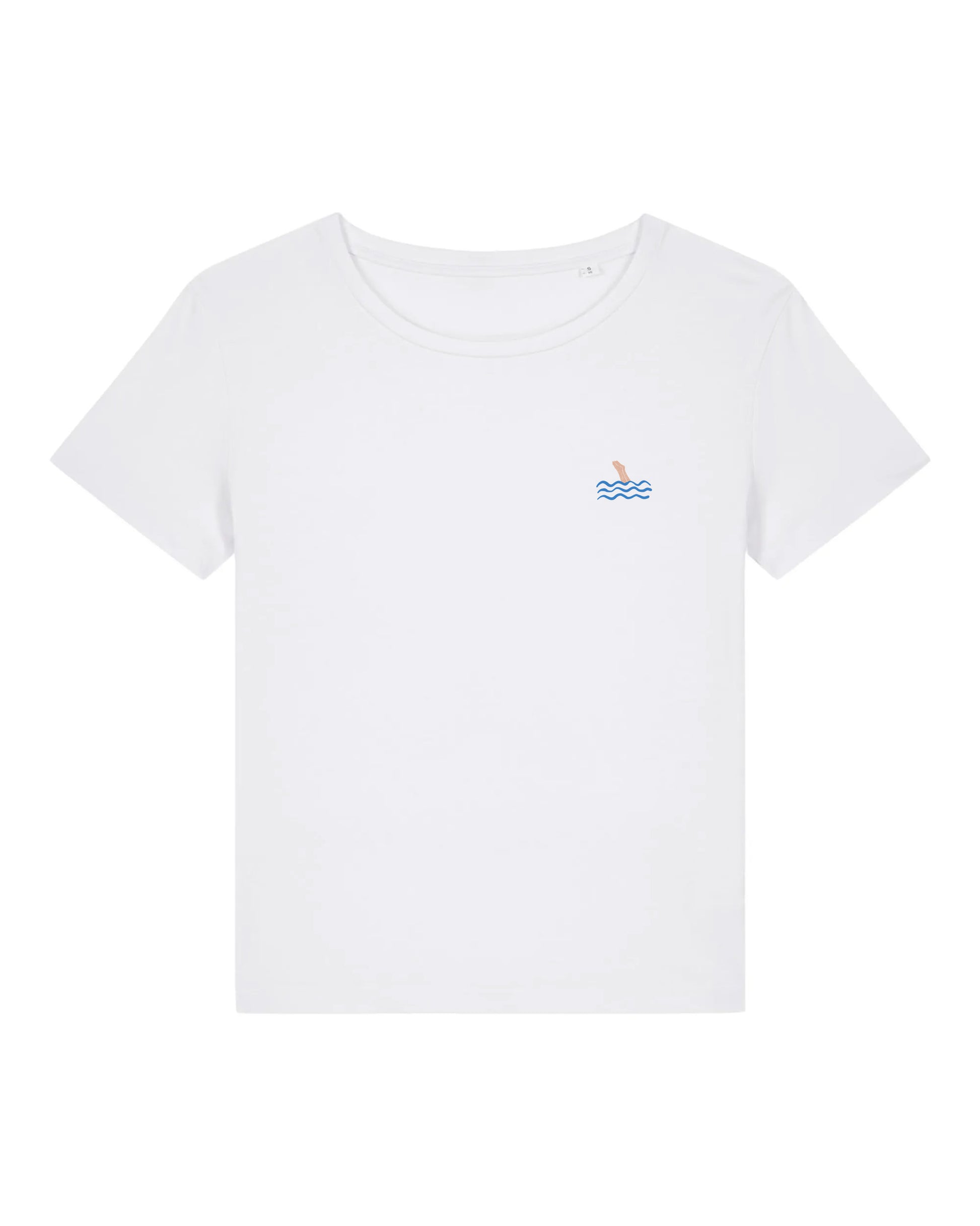 A soft, light-weight, and sustainable T-shirt made from 100% organic cotton. This white women’s tee features a small, hand-drawn design on the chest: a pair of playful legs diving into the sea – a lighthearted, minimalist nod to summer days and ocean escapes.