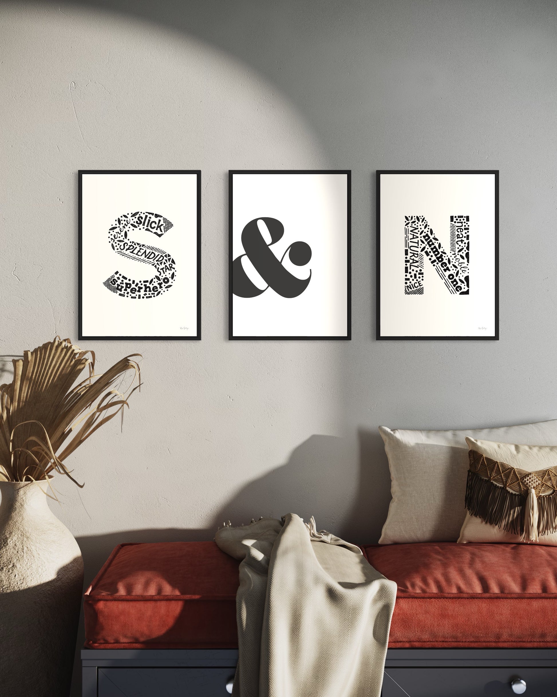 While the rest of collection is hand-drawn digitally with organic pencil textures, this "&" print has crisp and clean lines and fill (vectorised) for an aesthetic contrast.
